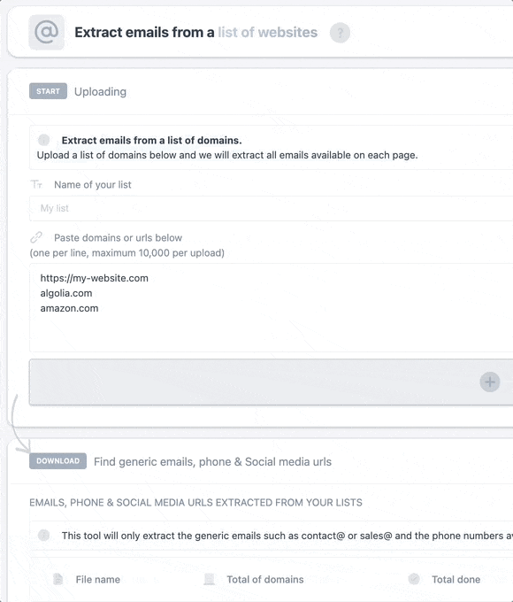 Fill in missing lead data instantly.- Upload a list of domains and get the emails